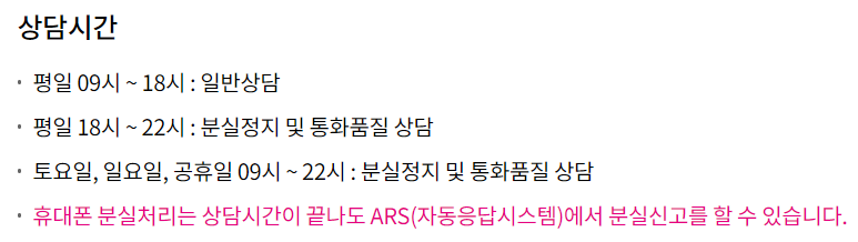 상담시간은 일반상담의 경우 평일 09:00 ~ 18:00 / 분실정지 및 통화품질 상담은 평일 18:00 ~ 22:00, 토, 일, 공휴일 09:00 ~ 22:00 입니다. 휴대폰 분실 처리는 상담시간이 끝나도 자동응답시스템으로 분실신고를 할 수 있다고 하네요.