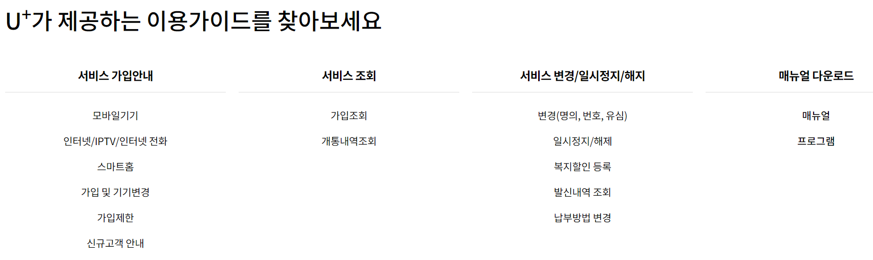 고객지원 사이트에서는 기본적으로 궁금한 부분에 대해서 검색을 통해서 바로 확인할 수 있습니다. 또한, 이용가이드를 제공하고 있어서 기본적인 문의 사항에 대해서는 고객지원 사이트에서 쉽고 간단하게 찾아볼 수 있습니다. LG U+ 고객센터로 전화해보시기 전에 해당 사이트에서 내용 확인이 가능한 부분인지 먼저 확인해보시면 더 빠르게 해결방안을 얻으실 수 있을 것 같습니다.