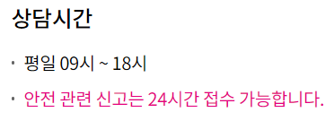 상담시간은 평일 09:00 ~ 18:00 이며, 안전 관련 신고는 24시간 접수 가능하다고 합니다.
