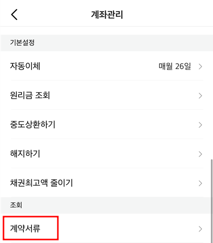 마지막으로 대출거래 약정서 출력 방법에 대해서 알아보겠습니다. 대출거래 약정서 같은 경우에는 아마 대환대출을 진행하셨거나 했으면 제출을 따로 해야하는 자료로 알고 있습니다. 저같은 경우에도 작년에 대환대출을 진행했기 때문에 대출거래 약정서를 다운로드 받았습니다. 약정서도 증명서 쪽에 있을 줄 알았는데 아무리 찾아봐도 없더라구요. 그래서 카카오 뱅크 상담을 통해서 확인 요청 드렸더니 이것도 카카오뱅크 어플 내에서 엄청 간단하게 출력을 할 수 있더라구요.