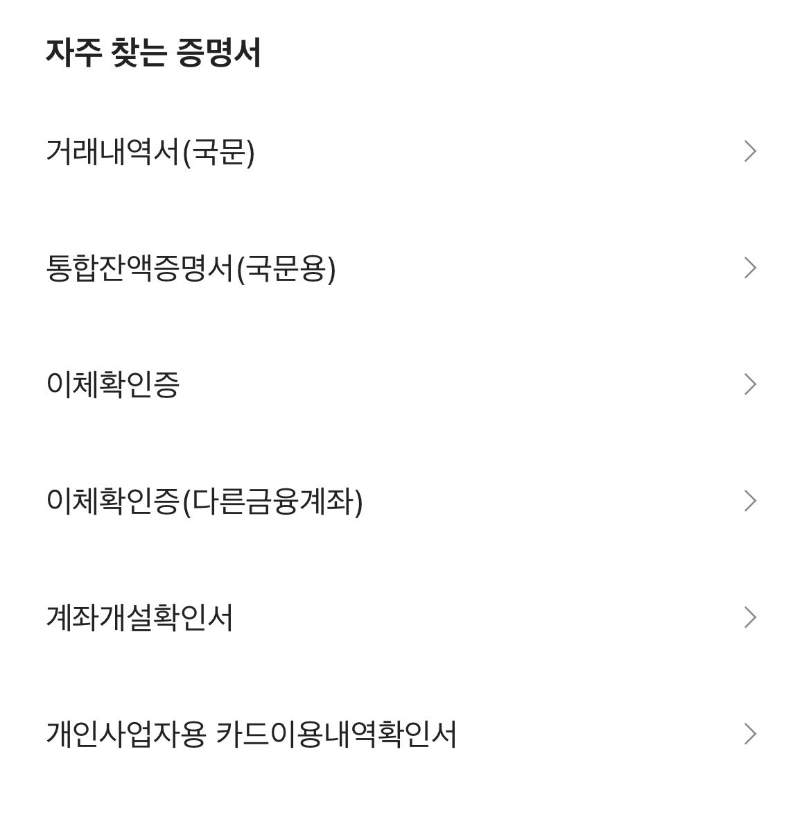 자주 찾는 증명서의 경우, 바로 클릭해서 들어가시면 해당 증명서를 출력하실 수가 있고, 전체 증명서에 있는 목록의 경우 본인이 뽑고자 하는 증명서와 관련있는 카테고리로 들어가주시면 됩니다. 대출 관련 서류면 대출 / 예금 펀드 관련 서류면 예금펀드 / 카드 관련 서류면 카드로!