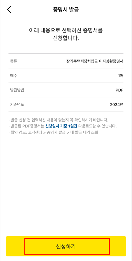인증번호만 입력하고 나면, 증명서 신청은 완료가 되구요. 본인의 발급 내역을 보시면 바로 다운로드를 진행할 수 있습니다. 발급내역을 다시 들어가시려면, 고객센터 > 증명서발급 > 내 발급 내역 조회로 들어가주시면 됩니다. 장기주택저당차입금 이자상환증명서도 별도의 수수료는 없습니다.
