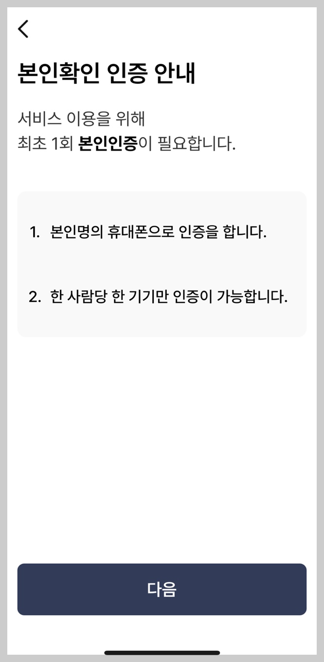 2. 어플에 들어가 어플에서 알려주는 방법을 차례대로 따라하기 (본인명의의 핸드폰으로 해주셔야 합니다.)