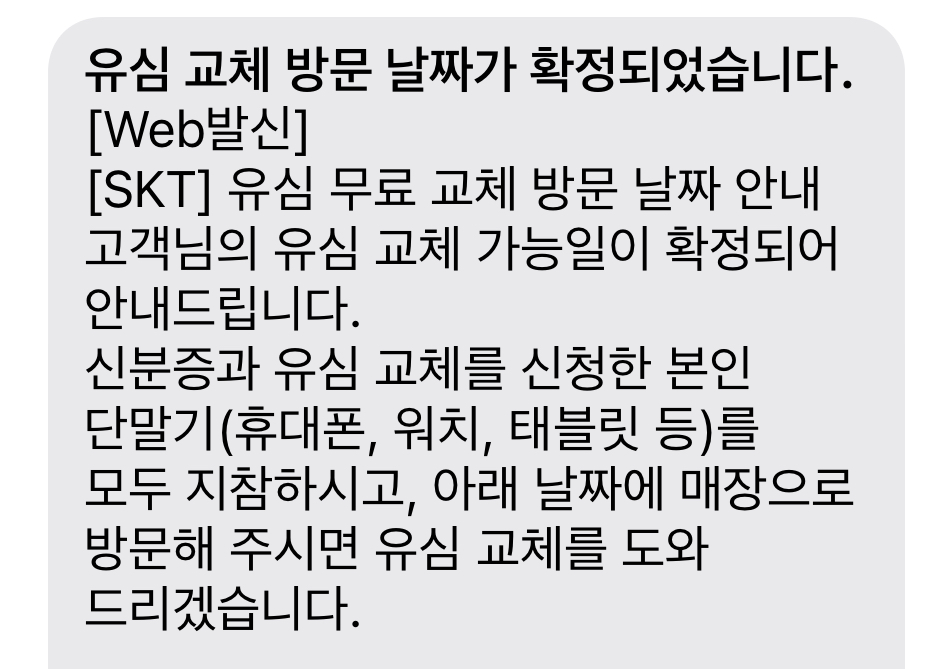 유심 교체 예약을 하고 한 4일만에 문자가 왔습니다! 유심 교체 가능날짜 전날에 문자가 오더라구요.