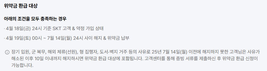 특정 사유로 인하여 7월 14일 이전에 해지하지 못하는 고객의 경우 사유가 해소된 이후 10일 이내까지 해지하시면 위약금 환급 대상에 포함된다고 하니 특정 사유가 있으신 분들은 미리 증빙 서류를 챙겨두시는 걸 추천드립니다.
