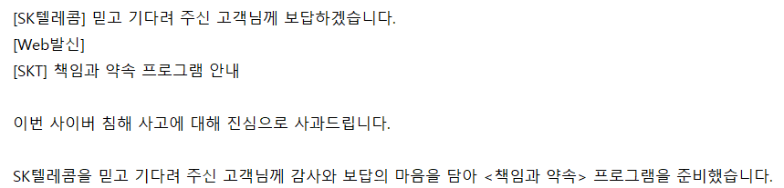 최근에 SKT 사이버 침해사고가 엄청난 이슈 중 하나였는데요. 사실 저는 유심을 변경한 이후에 SKT 를 계속 그냥 사용할 마음이었기 때문에 아무런 기대는 안했는데 갑자기 문자가 딱 왔더라구요!