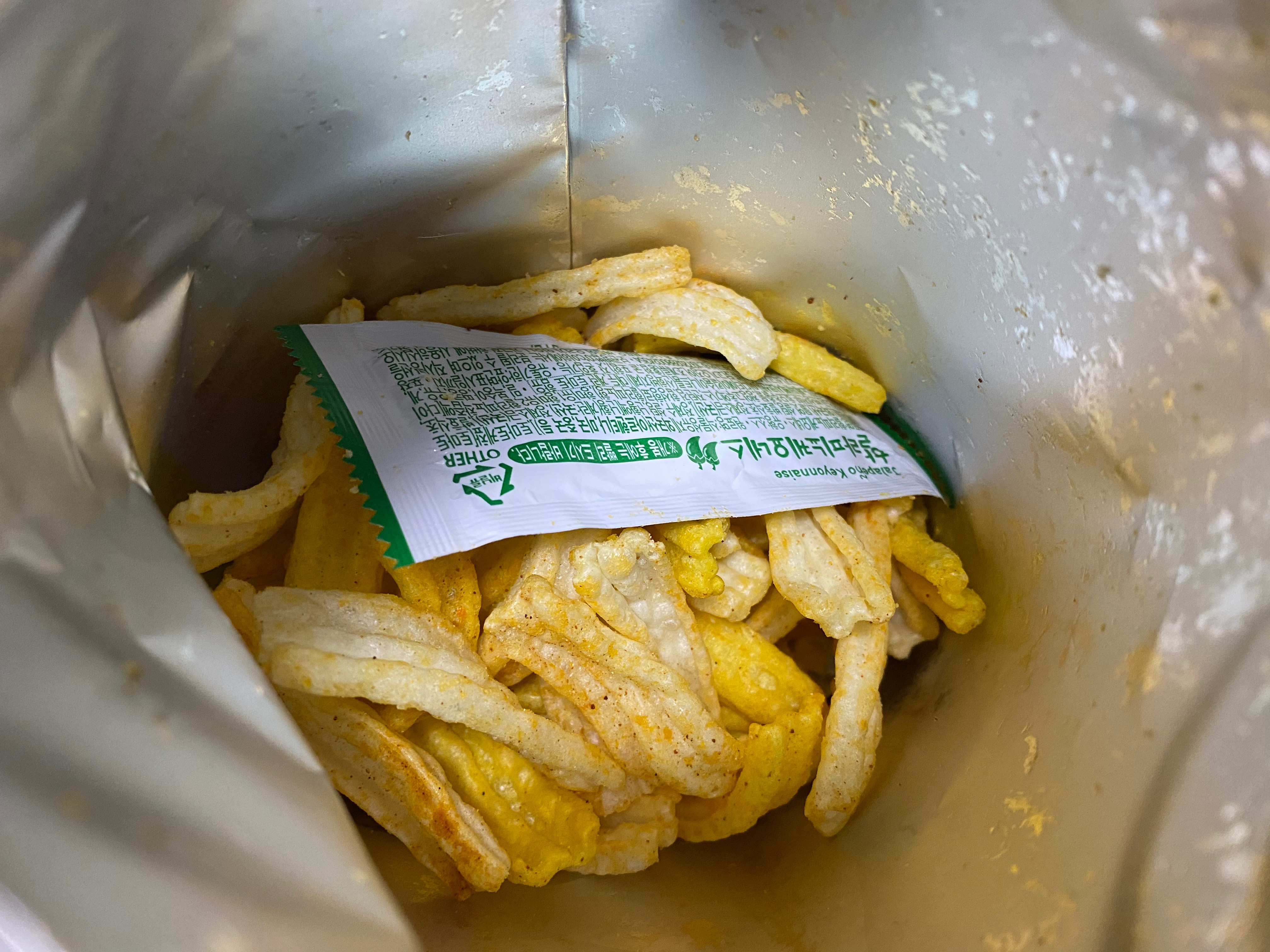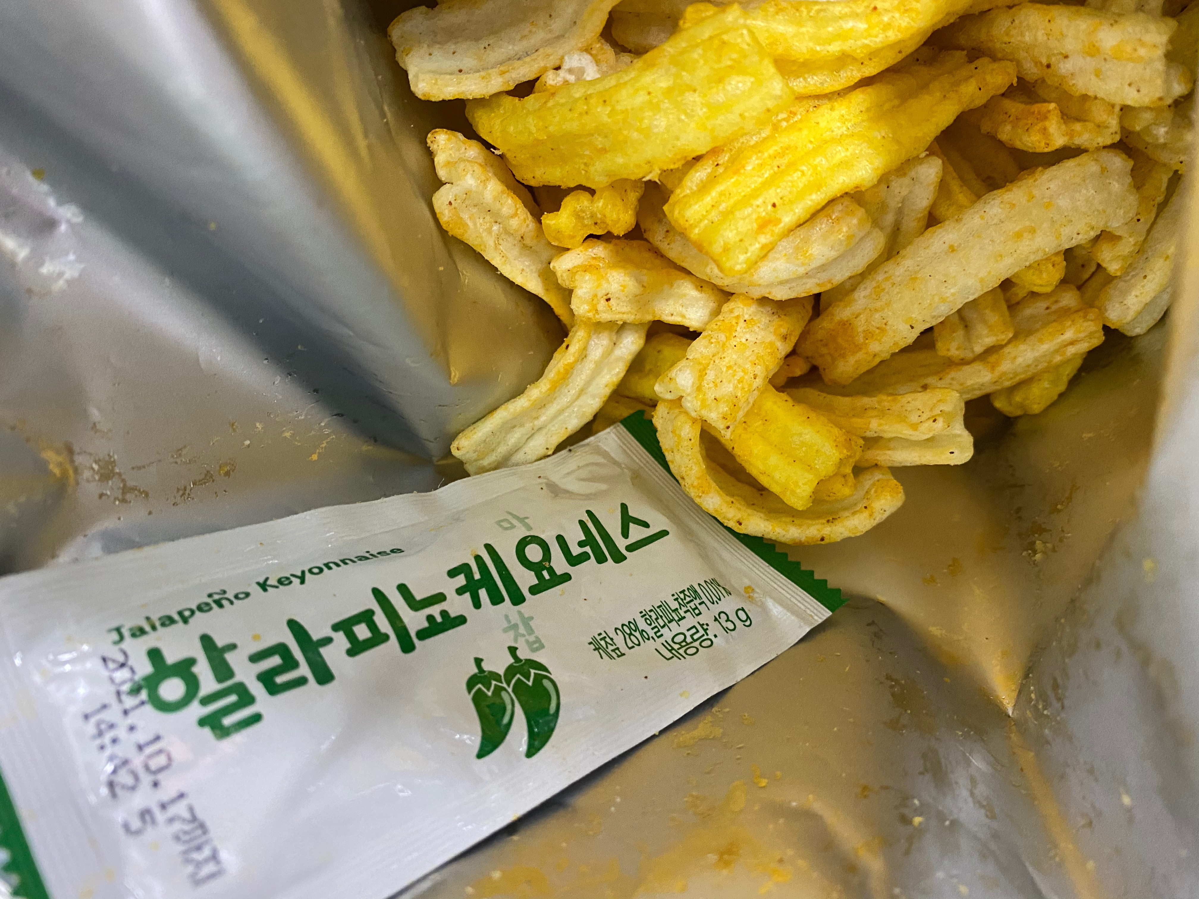 참깨라면타임은 이렇게 할라피노케요네스 소스가 같이 들어있습니다. 그림에는 통같이 생긴 걸로 나와있어서 그렇게 들어있을 줄 알았는데 케챱 소스 들어있는 것처럼 들어있네요. 소스 양 자체가 그렇게 많은 편은 아닌데, 과자랑은 딱 맞는 것 같습니다.