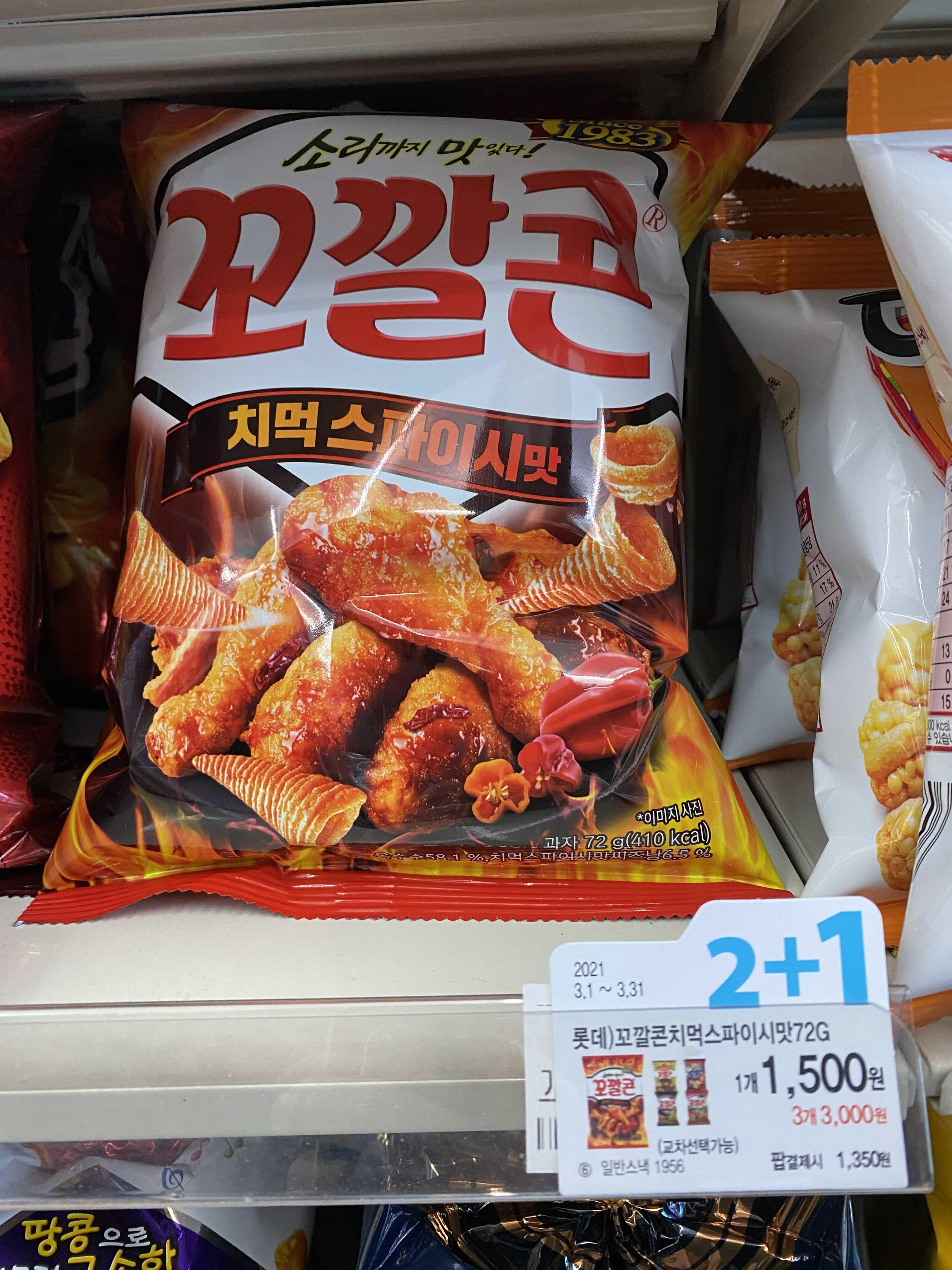 가격은 1,500원입니다. 투 플러스 원 행사도 하고 있더라구요. 맛이 어떨지는 모르니 저는 일단 꼬깔콘치먹스파이시맛 1개만 구입했습니다.