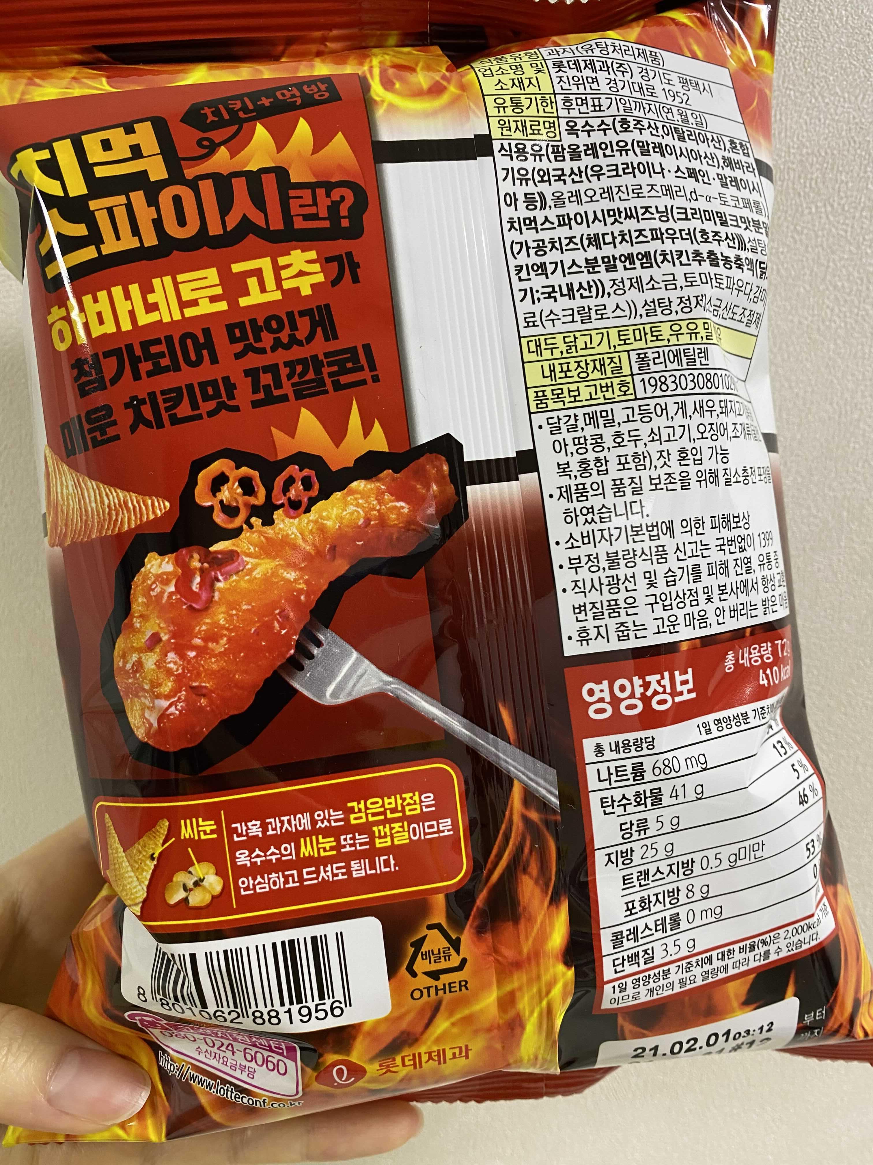 꼬깔콘이 1983년부터 만들어졌나봐요. 생각보다 엄청 오래됐네요. 제가 태어나기 전부터 있었다니. 생각지도 못했어요.매운 치킨맛 꼬칼콘이어서 치먹 스파이시인가봐요. 얼마나 매울지 궁금했습니다. 과자에 검은반점은 안심하고 먹어도 된다고 나와있네요. 꼬깔콘에는 항상 검은반점이 있지않았나요? 저는 사실 생각을 아예 안 했었거든요. 맛 보느라 바빴어가지구 하핫.
